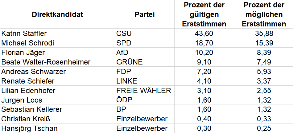Bei einer Wahlbeteiligung von 82,3 % bedeutet dies, dass sie nur von 35,88 % der wahlberechtigten Bürger im Wahlkreis 215 Fürstenfeldbruck gewählt wurde.
